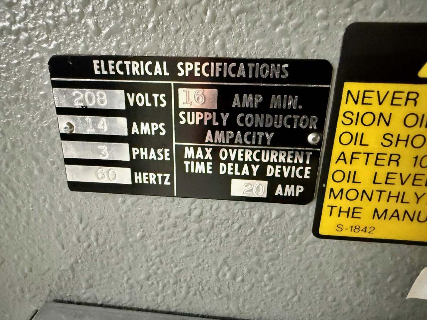 Specification:208 Volts, 60 Cycle 3 Phase 16 Amps.
